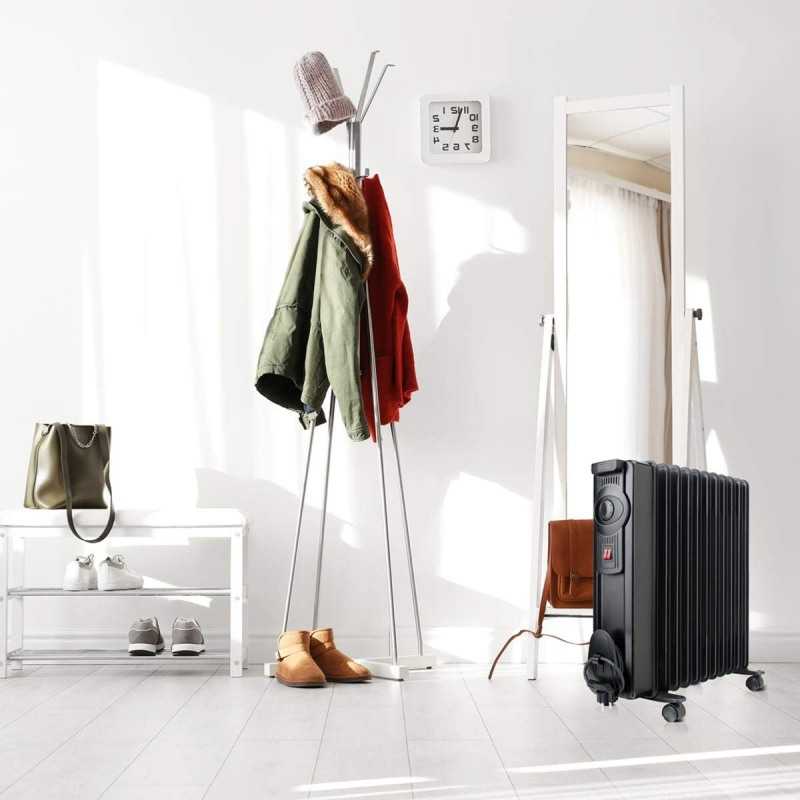 Proiectat pentru a se incadra perfect in orice decor, caloriferul electric a fost realizat din metal finisat cu vopsea neagra, rezistenta la temperaturile inalte. Cu un design elegant, caloriferul electric este portabil, astfel incat il puteti transporta cu usurinta in orice incapere, datorita rotilor sale multidirectionale si a manerului ergonomic, pentru o manevrare usoara. De asemenea, puteti economisi spatiul de depozitare cu ajutorul sistemului de stocare a cablului, incorporat.