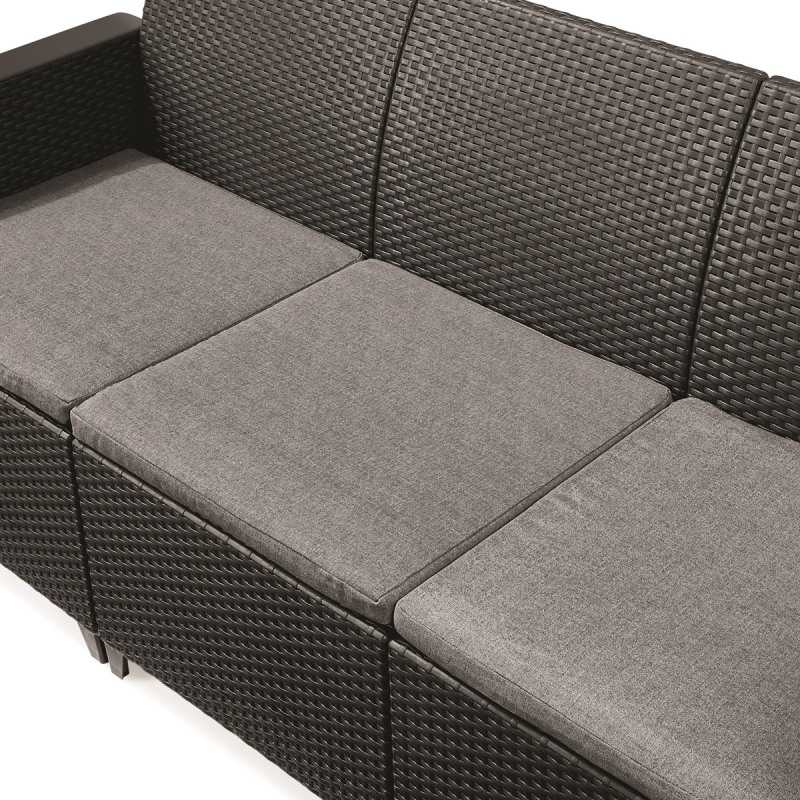 Canapea 3 locuri grafit Keter Elodie este o piesa de mobilier exterior moderna si eleganta, ideala pentru gradini si terase contemporane sau pentru zona cu piscina, potrivita atat pentru momentele de relaxare, cat si pentru intalnirile cu prietenii sau familia, ce ofera un echilibru intre estetica si confort.