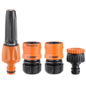 Setul contine tot ce va este necesar pentru irigare in afara de furtun. Acesta include o duza reglabila compacta si practica, care va permite sa ajustati debitul de apa de la jet la spray, un conector de3/4” cu un adaptor de 1/2” care este usor de instalat si perfect etans si doua cuple automate cu click rapid, unul cu sistemul Aquastop, care va permite sa va conectati si deconactati rapid duza, fara a fi necesar sa inchideti robinetul.