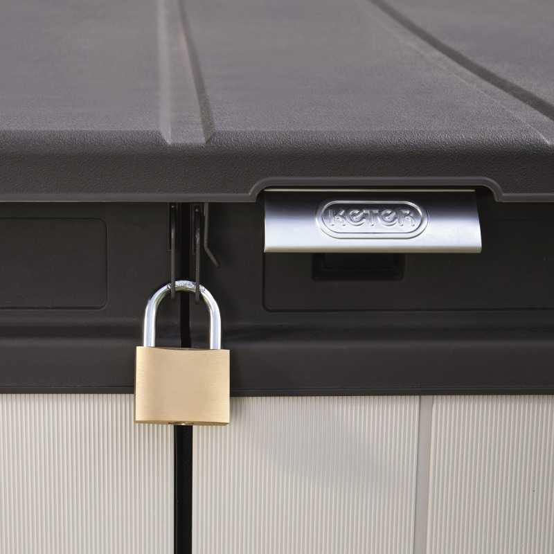 Dulapul pentru gradina Keter Premier XL dispune de sistem de ventilatie care asigura circulatia aerului pentru a proteja obiectele depozitate de umiditate si mentine interiorul dulapului uscat si ventilat, indiferent de sezon, astfel incat te vei bucura de dulapul de gradina aerisit, fara urma de mucegai. De asemenea, usile dulapului Keter Premier XL pot fi blocate cu un zavor metalic solid, care poate fi, de asemenea, securizat cu un lacat, astfel incat puteti asigura obiectele depozitate in interior. Lacatul nu este inclus.