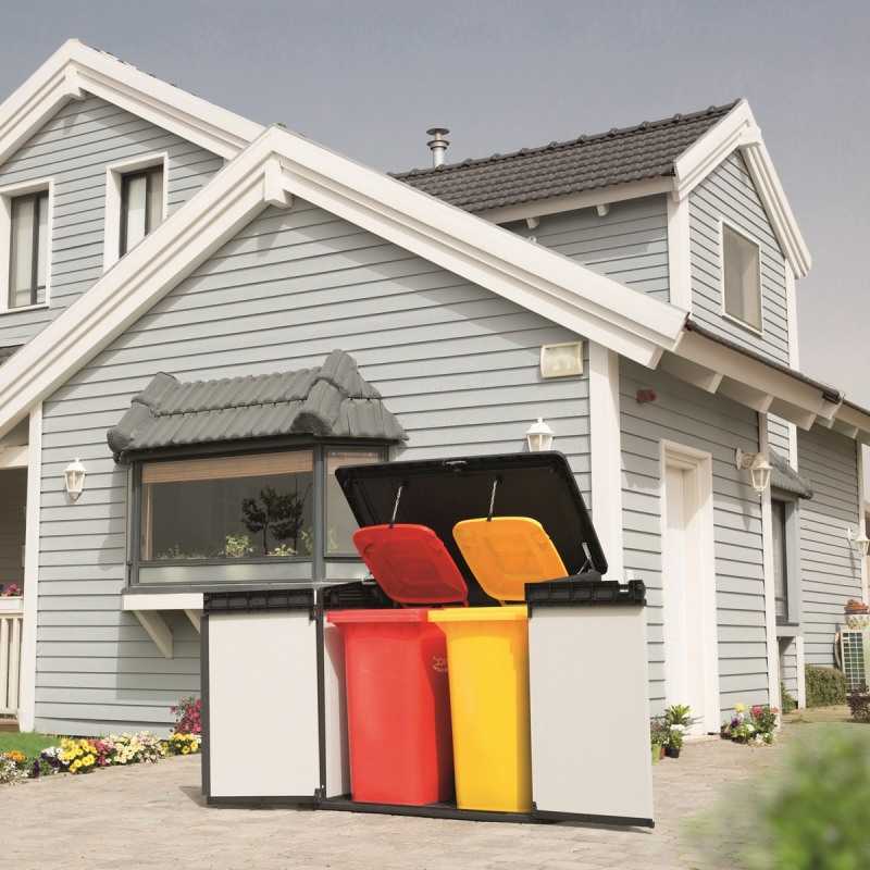 Dulap mascare europubele este prevazut cu sistem hidraulic pentru deschiderea si inchiderea facila, atat frontala, cat si superioara si kit pentru deschiderea pubelelor, depozitarea acestora fiind o optiune. Dulapul pentru gradina se integreaza cu usurinta in decorul gradinei sau terasei. Intretinerea este facila si se realizeaza cu apa si detergent.