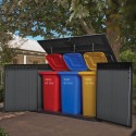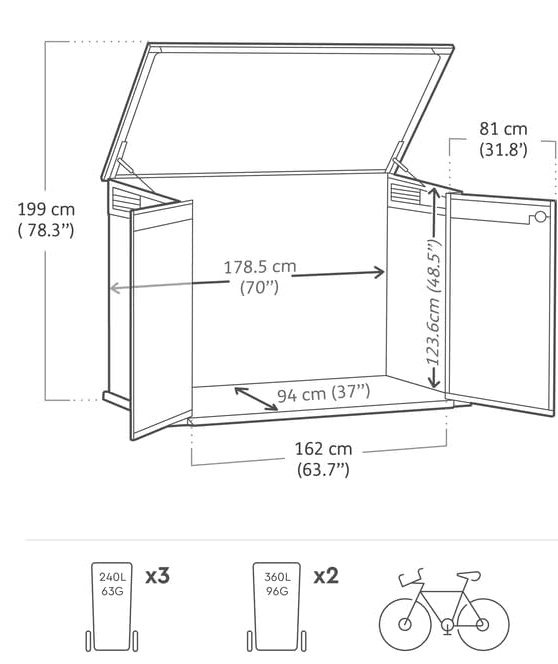 Masca pubele gunoi este fabricata din polirasina Evotech™, un material de inalta calitate cu o tehnologie compozita noua si avansata, care protejeaza produsele depozitate impotriva conditiilor atmosferice nefavorabile, a murdariei, a rozatoarelor si a umiditatii. De asemenea, dulapul mascare europubele de culoare gri inchis are rezistenta ridicata la intemperii si raze UV si imbina durabilitatea materialului cu aspectul rustic si textura din imitatie de lemn natural, astfel incat, peretii dulapului Keter Cortina Mega nu vor rugini si nu se vor deteriora, oferind o solutie de depozitare exterioara fara intretinere. In plus, dulapul ofera o gama larga de posibilitati de personalizare, poate fi vopsit, iar in interior se pot monta rafturi si etajere, ce sporesc valorile functionale.
