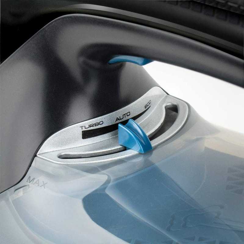 Fierul de calcat este prevazut cu termostat reglabil, sistem de oprire automat in caz de inactivitate, rezervor de apa de 230 ml si sistem de calcare cu aburi cu generator si pompa incorporate, ce asigura alimentarea continua cu abur pentru rezultate optime. Acesta include 3 functii predefinite pentru calcare mai usoara, precum functia Auto, potrivita pentru toate tipurile de tesaturi, functia ECO pentru calcarea eficienta si functia Turbo pentru calcare rapida.