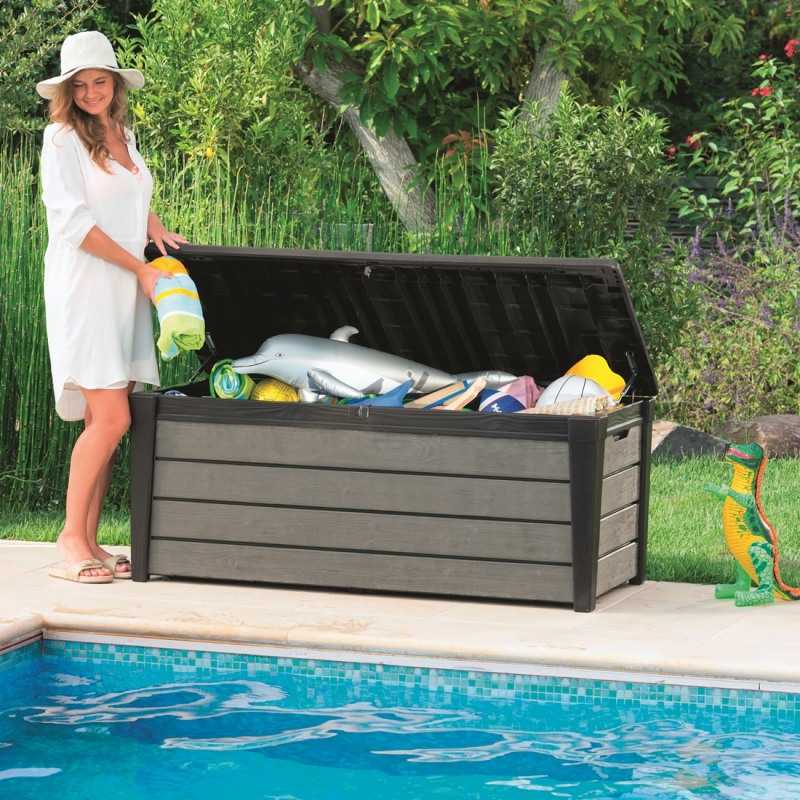 Lada depozitare gradina, pentru unelte si perne, cu capac, material polipropilena, culoare gri, Keter Brushwood, 455 L - Descriere