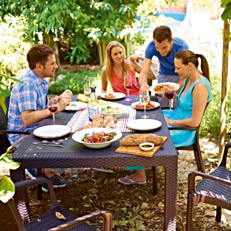 Masa Keter din colectia Melody este definita de designul elegant din imitatie de ratan si poate fi incadrata cu usurinta in orice stil de decor, atat clasic, cat si modern. De asemenea, blatul mesei este prevazut cu un orificiu in mijloc ce va permite amplasarea unei umbrele, astfel incat, va puteti bucura de un pranz delicios in gradina, chiar si in cele mai toride zile de vara.